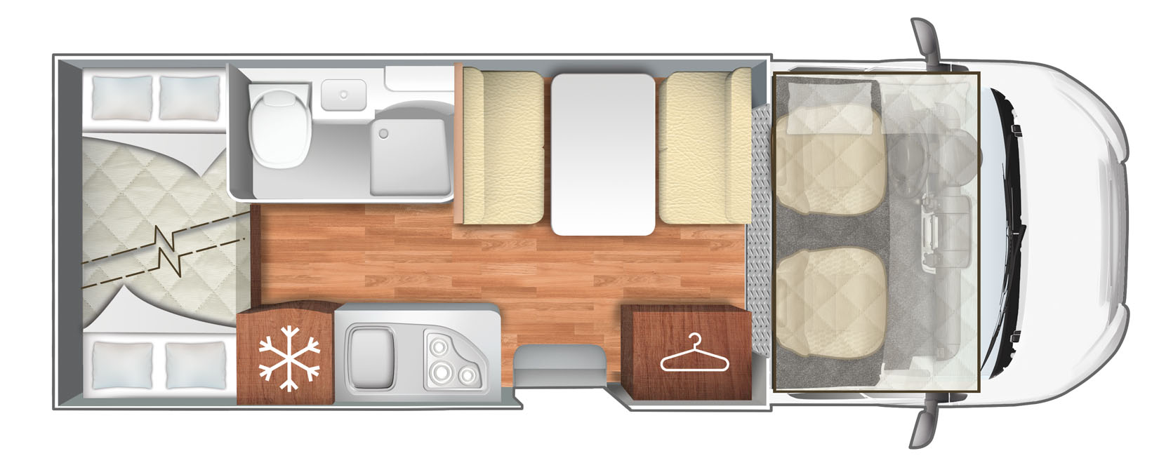 Deze aantrekkelijke 6 persoons alkoof is voorzien van 4 vaste slaaplaatsen. De eettafels kunnen veranderd worden in een tweepersoonsbed, zodat u en uw familie of vriendengroep kunnen genieten van eeen zalige vakantie.